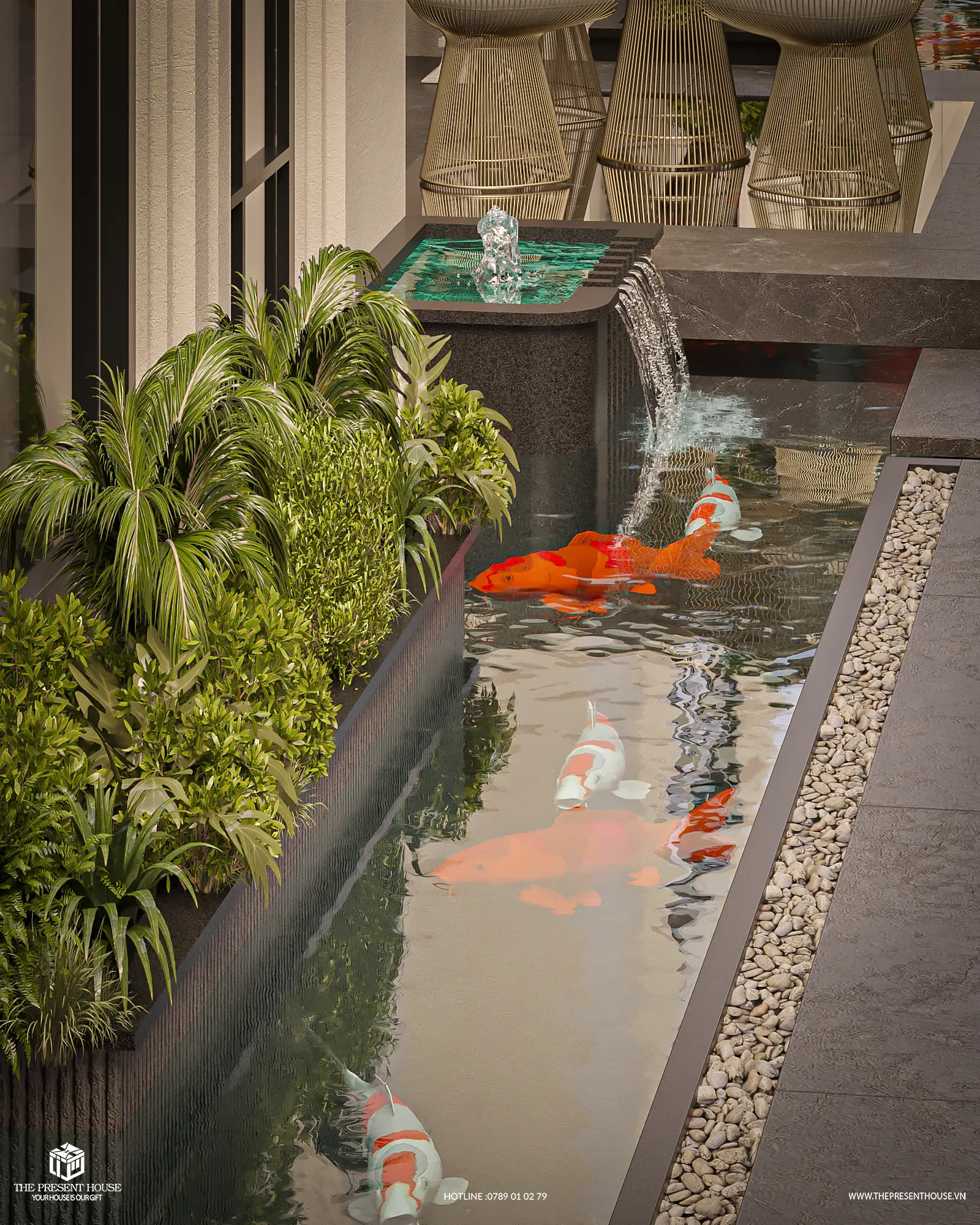 Có những ngôi nhà chỉ là nơi để ở, nhưng cũng có những ngôi nhà sinh ra để ta thật sự thuộc về. Mirella Villa là một không gian như thế — nơi ánh nắng đầu ngày khẽ chạm qua ô cửa kính và hoàng hôn lặng lẽ buông xuống mặt hồ Koi, khiến nhịp sống dường như chậm lại. Bước qua cánh cổng, cảm giác đầu tiên không phải là sự phô trương mà là sự an yên rất tự nhiên. Hệ cửa vòm đón ánh sáng, khoảng sân xanh mở ra hơi thở của thiên nhiên, cầu thang xoắn mềm mại dẫn lối vào không gian sống rộng mở. Phòng khách cao thoáng đón gió và ánh sáng, còn căn bếp trở thành trái tim ấm cúng của ngôi nhà.