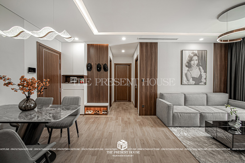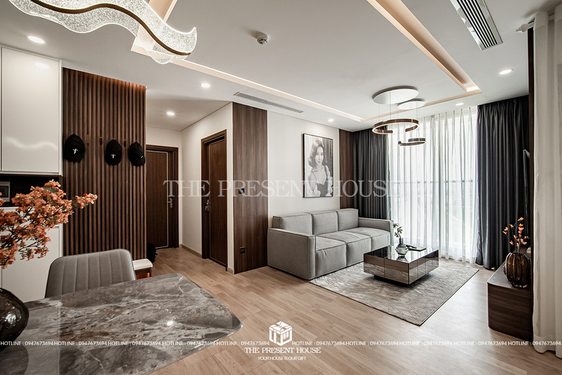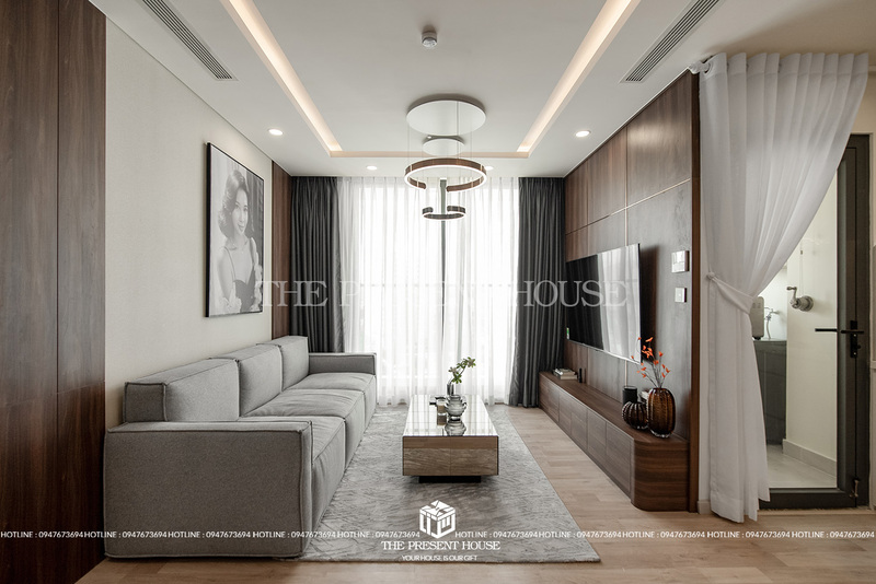 Gam màu trung tính như xám, trắng và nâu gỗ tạo nên nền tảng vững chắc cho cảm giác ấm áp và thanh lịch. Bộ sofa vải dáng vuông gọn gàng, kết hợp cùng bàn trà mặt đá và thảm lông nhẹ nhàng tạo nên điểm nhấn vừa đủ, không phô trương mà vẫn sang trọng.
