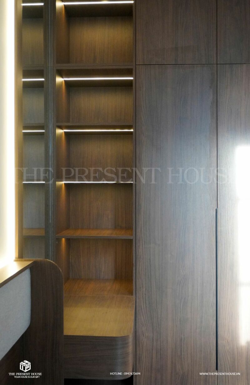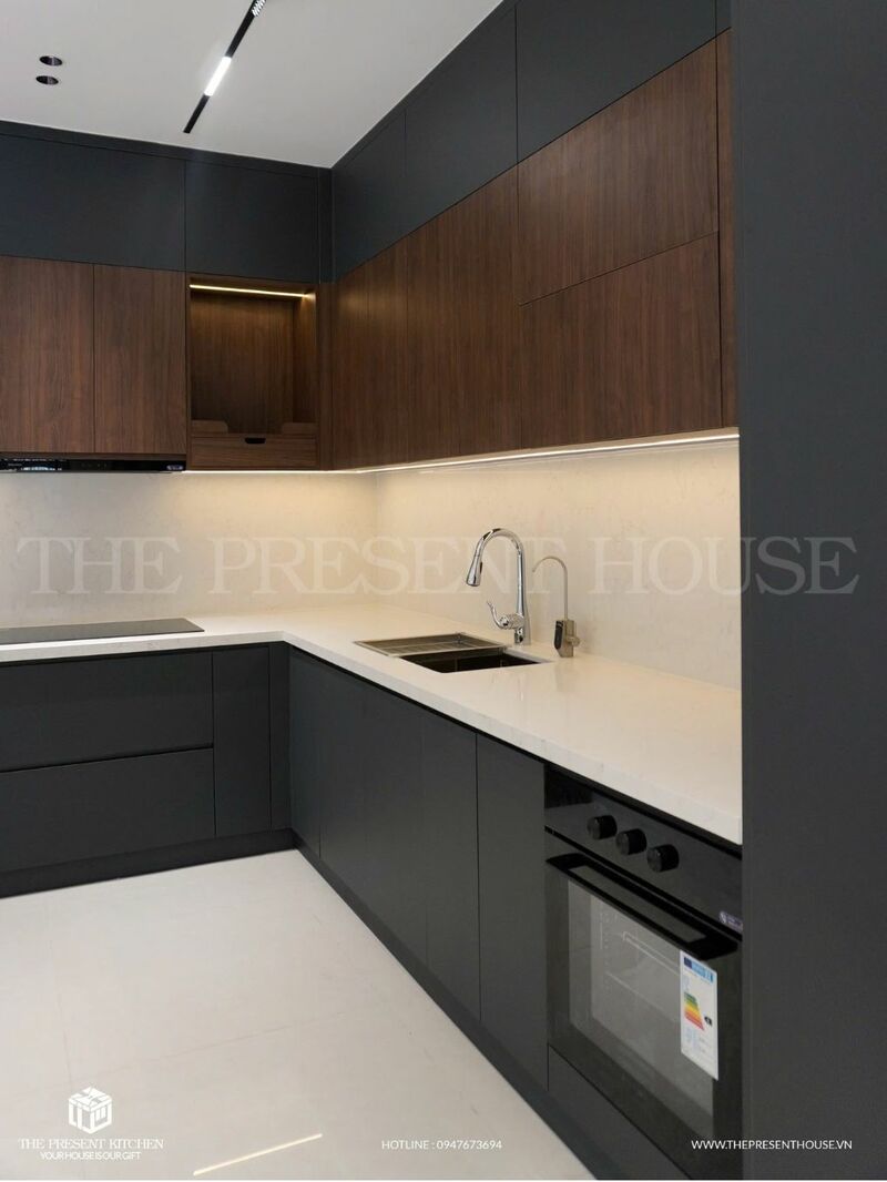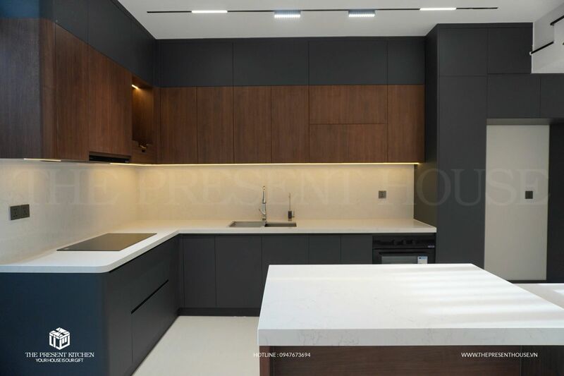 Hệ thống lưu trữ tối ưu, cảm biến ánh sáng và công nghệ điều khiển từ xa giúp mọi thao tác trở nên dễ dàng hơn bao giờ hết. Kết hợp cùng chất liệu cao cấp như đá thạch anh, gỗ An Cường vân gỗ óc chó phối cùng toent màu xám chì thời thượng tạo nên không gian đầy tinh tế và đẳng cấp.